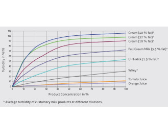 The ITM-51 turbidimeter can measure not only the relative turbidity in a product, but also the fat content in milk. For each product, a preset for the turbidity values at which an alarm signal is to be issued can be programmed in on the sensor itself. To do this, a sample is taken, and the laboratory value determined is used as the setpoint. As the diagram below shows, the %TU values of milk with different fat contents differ significantly, so that the turbidity measurement can achieve virtually 100 % reliability for this quality control.