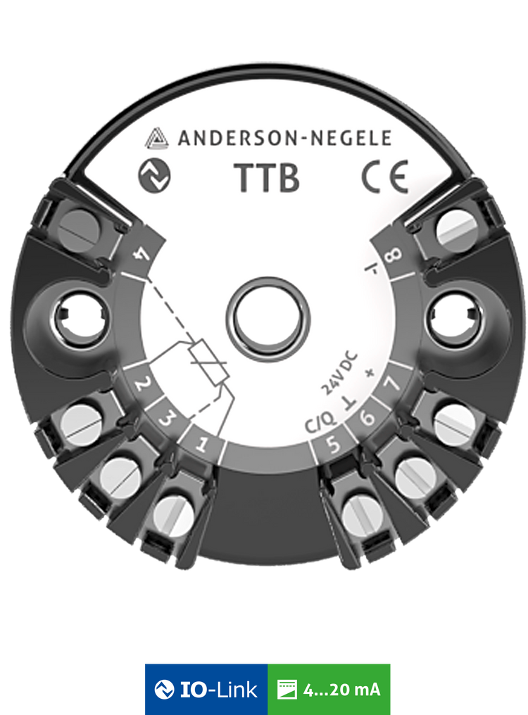 Programmable transmitter with Flex-Hybrid technology with IO-Link and analog output. The device can be installed directly in the connecting head of the temperature sensor (e.g. TSB series) or a third-party device with head DIN-B.